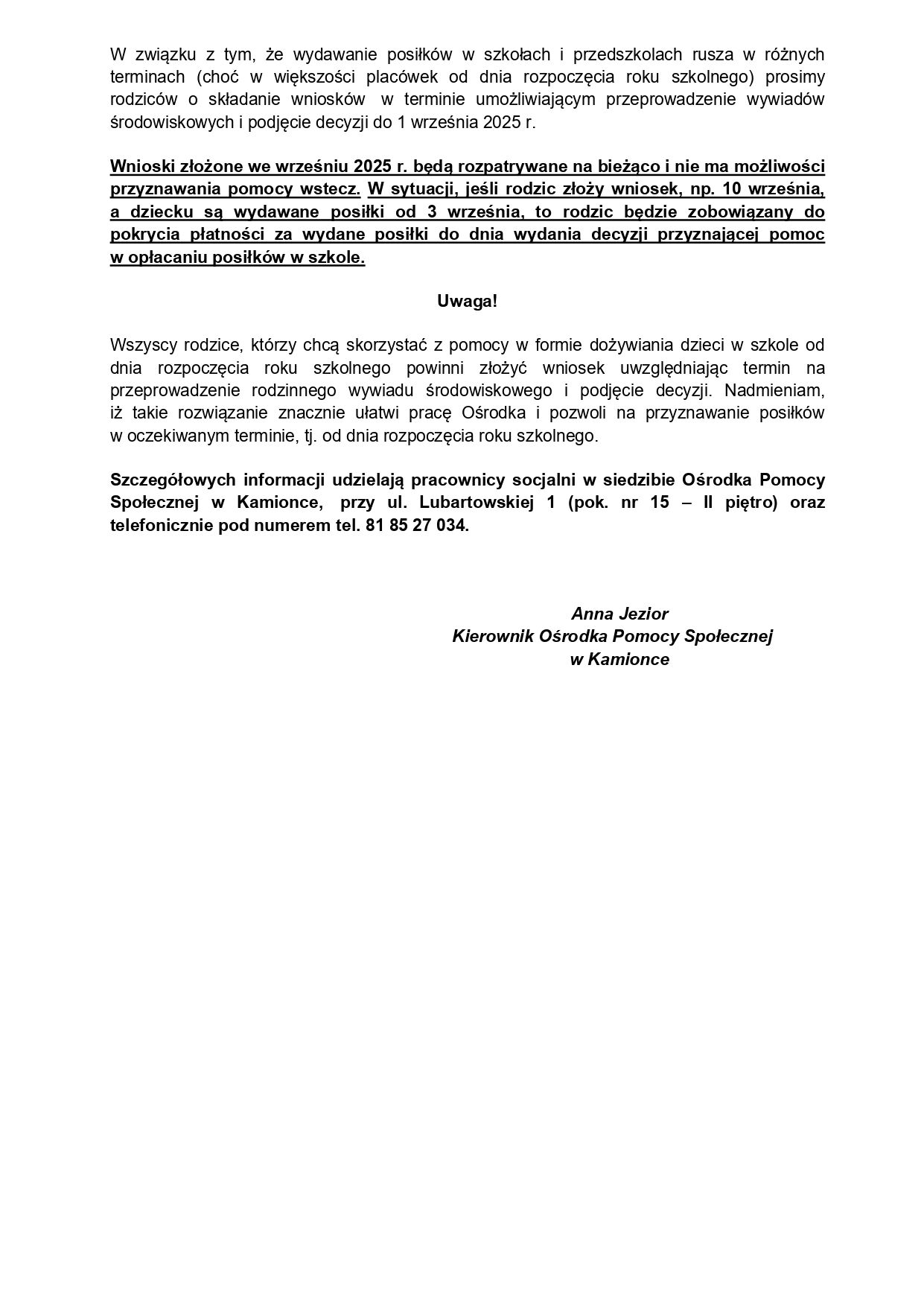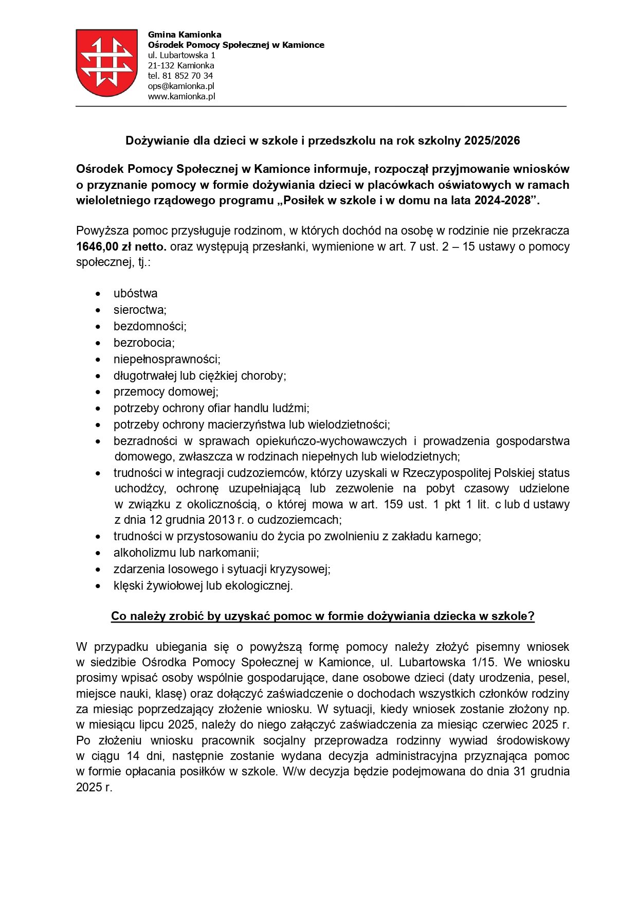 Komunikat Ośrodka Pomocy Społecznej w Kamionce